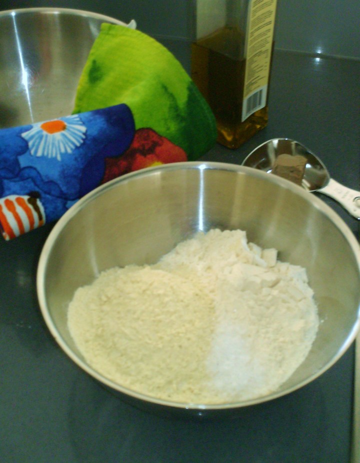Pohjataikinan valmistin ”tavalliseen tapaan”, mutta käytin jauhoina osittain Durum-vehnäjauhoa eli pastajauhoa. Sitä löytyy ainakin Tuottajain Myllyn pakkaamana ihan tavallisista marketeista.
