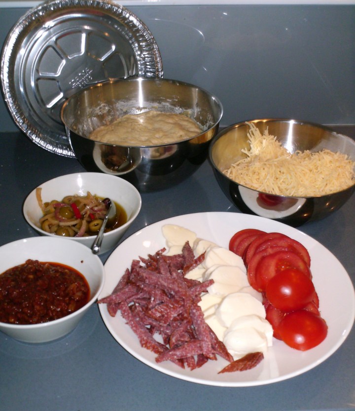 Tomaattikastike vasemmalla alhaalla, sen yläpuolella loput edellisviikonlopun marinoiduista oliiveista, lautasella edessä salamia, mozzarellaa ja tomaatteja. Taustalla foliovuoka, kohonnut pizzataikina ja juustoraaste, joka tällä kerralla oli kaupan valmista pizzaraastetta (on siinäkin tuotteella nimi, liekö juustoa lainkaan?).
