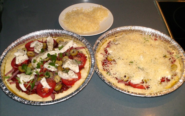 Pizzat vuo’oissaan, vasemmalla ennen juustoa.