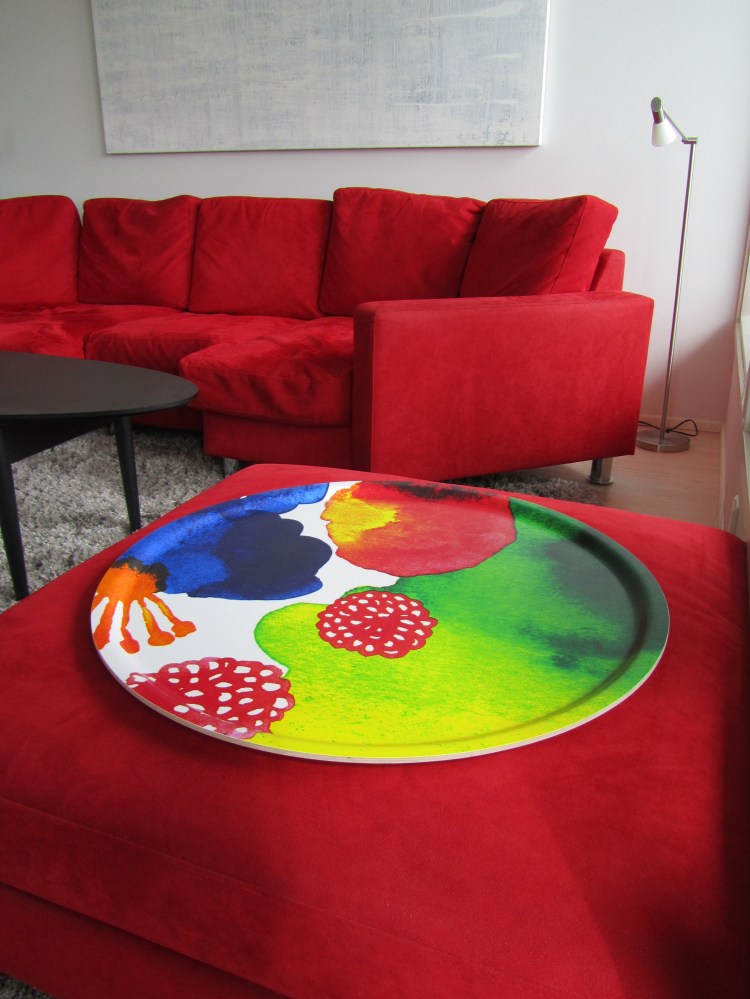 Muistin, että meillähän on muutama vuosi sitten hankittu Marimekon Juhannustaika-tarjotin, ja pengoin sen esiin. Samaa sarjaa löytyy myös pöytäliina, joka kenties pääsee juhannuspöydän peitteeksi. Sen ainoa vika on tarjottavien ”hukkuminen” värikylläisyyteen, joten vaihtoehtona löytyy samaisen putiikin Siirtolapuutarha.