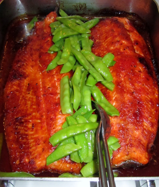 Kuumenna uuni 200 C, poista folio vuoasta ja kypsennä kalaa noin 40 minuuttia tai kunnes se saa kauniin tummanpunaruskean pinnan. Kiehauta herneet (meillä sattui olemaan tuoreita, mutta pakastetutkin sopivat tai jätä pois jos et pidä) ja nostele ne kypsälle kalalle. Tarjoile raikkaan salaatin kera. Vuokaan muodostuu niukasti hyvänmakuista lientä, joka sopii kastikkeeksi.