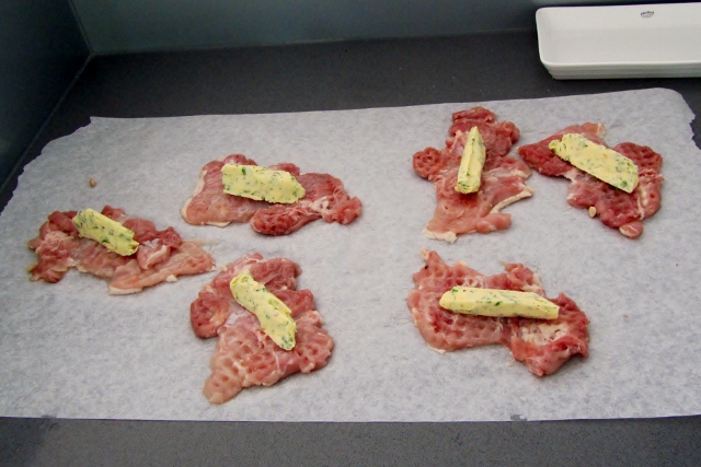 Tästä lähdetään liikkeelle: maustevoi on jähmettynyt ja broilerinpalat odottavat nuijimista. Valitettavasti olin hankkinut meille paistileikkeitä rintaleikkeiden asemesta. Maku on varmasti yhtä hyvä, mutta näiden käsitteleminen oli hankalampaa.