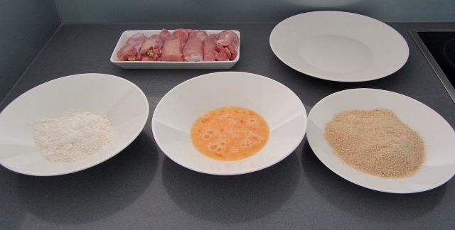 Kaksinkertaisen paneerauksen vaiheet: vehnäjauho, kananmuna, korppujauho.