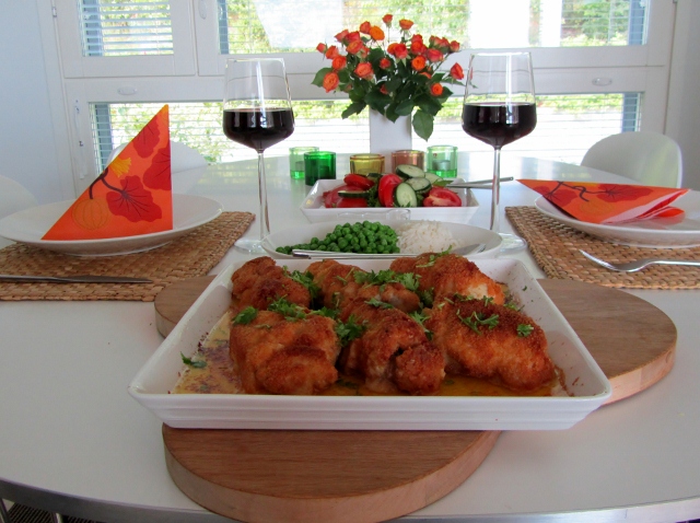 Ja sitten tipunpalaset ovat valmiita nautittaviksi riisin, herneiden ja raikkaan salaatin kera. Punaviini sopi kyytipojaksi vallan mainiosti.
