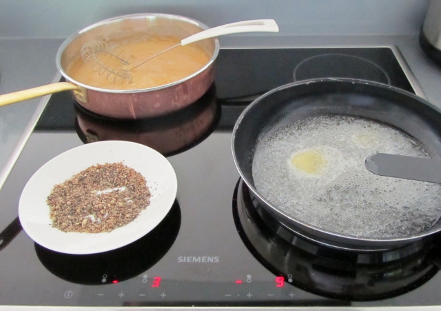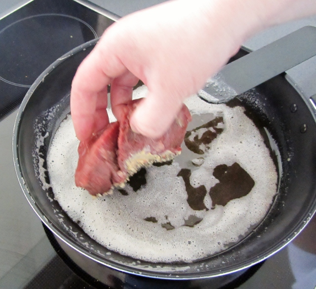Kuumenna paistinpannu ja sulata siinä voita. Lirauta joukkoon rypsiöljyä. Pannu on kyllin kuuma, kun voin vaahto saa ruskeaa väriä ja pannusta nousee pähkinäinen tuoksu.