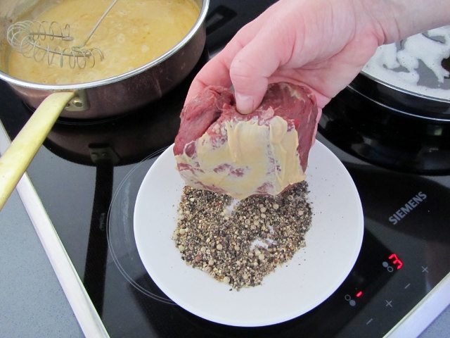 Esikäsittele pihvit. Sivele pihvien toinen puoli samalla sinapilla, jota laitoit kastikkeeseen. Murskaa musta- ja valkopippureita ja laita murske lautaselle odottamaan.