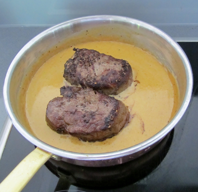 Nosta pihvi kastikkeeseen ja valele niitä. Kuumenna sen verran, että kastike on kuumaa.