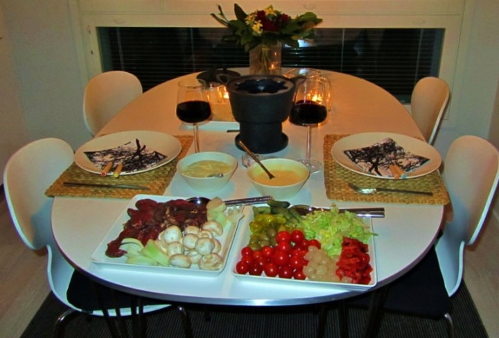 Hämäräkuvaaminen ei oikein suju, mutta ehkä tästä saa käsityksen fondueateriastamme.