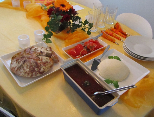 Rouva R. puolestaan oli suunnitellut lauantaiaamupäivään pienen välipalan ennen ateriointia. Leivoin aamuvarhaisella Pataleivän, jonka olin laittanut tekeytymään perjantaina. Lisäksi pöytään katettiin Terriini maksamakkarasta (oikotie patén valmistamiseen), kotijuustoa sekä marinoituja paprikoita.