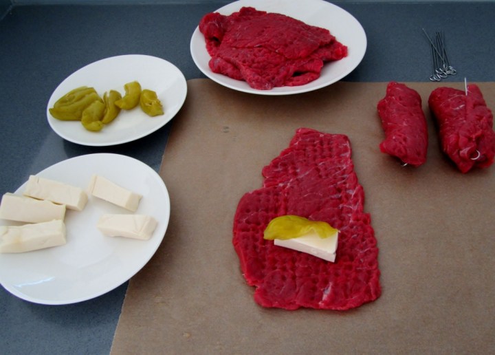 Leikkaa sisäpaisti vajaan sentin paksuisiksi viipaleiksi. Nuiji ne kaksinkertaisen muovin välissä. Laita kullekin lihaviipaleelle tyvestä ja siemenistä puhdistettu chilipalko sekä pikkusormenpaksuinen suikale sulatejuustoa. Kääri rullalle ja kiinnitä cocktailtikulla.