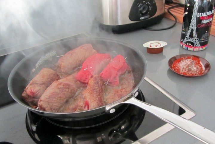 Huuhdo pannu tarvittaessa paistoerien välillä. Kun viimeinen satsi on paistettu, lisää pannulle punaviini ja kiehauta se. Kaada pataan siivilän kautta. Lisää pannulle nyt vettä ja sulata liemitiiviste siihen, kaada pataan. Nestettä pitäisi olla sen verran, että noin puolet rullista peittyy. Peitä pata kannella ja hauduta miedolla lämmöllä noin tunnin ajan. Haudutuksen voi tehdä myös uunissa, noin 125 C:ssa. Uunissa haudutusaikaa voi pidentää pariksi tunniksi.