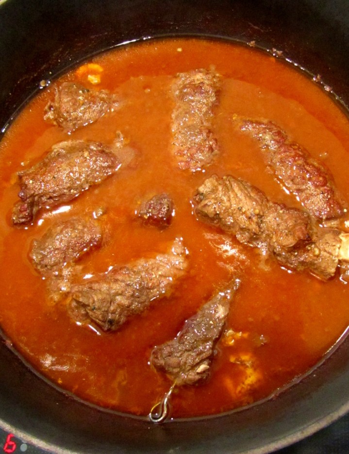 Tältä näyttää pata vietettyään uunissa pari tuntia. Nyt alkaa liemen suurustaminen.