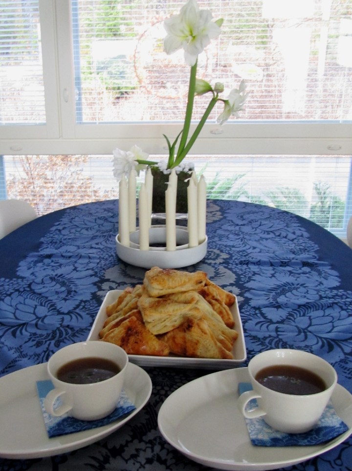 Lihalientä ja -pasteijoita jouluaaton lounaalla. Kynttilät näyttävät olevan ihan vinksinvonksin