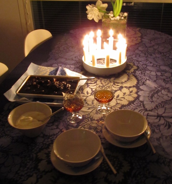 Vieläkin hämärämmissä iltatunnelmissa liekitin meille konjakkiluumut, jotka söimme kermavaahdon kera. Kyytipoikana tietysti samaista konjakkia. Nam, tämä kyllä vie kielen mennessään!
