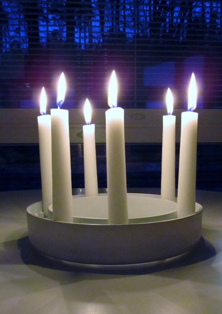 Aiemmin hankkimani valkoinen Gloria-kynttilänjalka (yläkuvassa) toimi hyvin ja se kiersikin ympäri yläkertaa valaistustehtävissään.