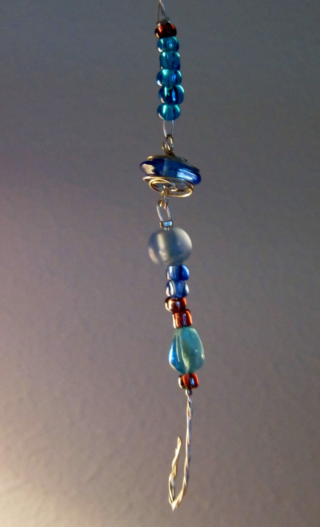 Kuvan viehättävä jouluviehe puolestaan on Rva Uchimurinan askartelema. Ideana on siis ripustaa viehe joulukuuseen ja vieheeseen varsinainen joulukoriste. Koska meillä ei ollut kuusta, ei ihanuus löytänyt vielä paikkaansa. Nyt se roikkuu työvalaisimessani ja kimaltelee somasti.