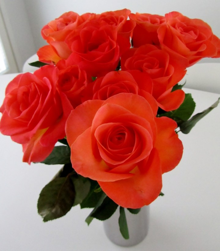 Keittiön pöydällä on kimppu oransseja ruusuja. Herra toi ne torstaina omalta kauppareissultaan. ”Reilun kaupan” ruusukimpuissa on melkoisia laadullisia eroja: toisinaan ne nuupahtavat melkein heti ja toisinaan – kuten nyt – avautuvat kauniisti.
