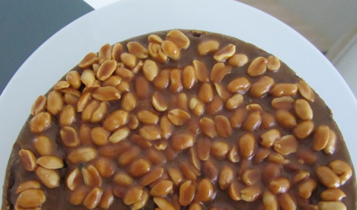 Valmista kuorrutus: mittaa paksupohjaiseen kattilaan kerma ja fariinisokeri. Keitä seosta hiljalleen noin 15 minuuttia eli kunnes se pysyy kakun pinnalla. sekoita kinuskin joukkoon suolapähkinät ja valuta kuumana hitaasti kakun päälle.