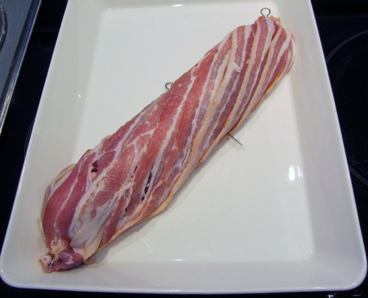Kuivaa file talouspaperiin. Levitä leivinpaperiarkille pekoniviipleet limittäin niin, että niistä muodostuu noin A4-kokoinen suorakulmio. Asettele possunfile diagonaaliin suoraakulmiolle. Ripota fileelle suolaa ja mustapippurirouhetta. Kääri pekonit fileen ympärille ja kiinnitä ne vielä cocktail-tikuilla tai vastaavilla.