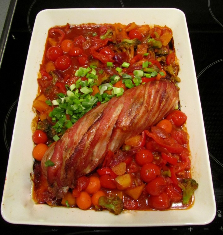Onneksi edes yksi ruoka onnistui: pekonoitua possunfilettä chilisellä (taas!) kasvispedillä. Virikkeen tähän sapuskaan sain, kun törmäsin kauppareissulla tuote-esittelijään ja uuteen chilivalmisteeseen.