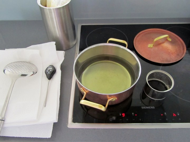 Ota lähistölle myös kattilan kansi, jolla voi tukahduttaa mahdollisen rasvapalon. Varaa reikäkauha ja valutusastia leivonnaisille. Peitä se talouspaperilla.