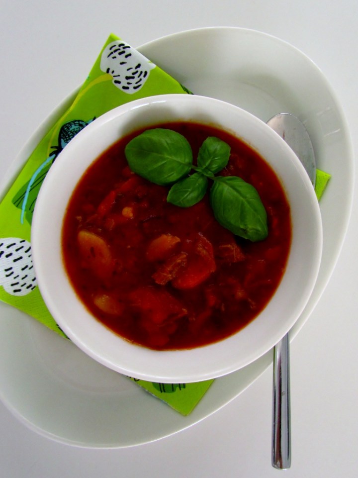 Esikäsittele kaikki keittoon tulevat kasvikset. Kuumenna isossa kattilassa tilkka öljyä. Kuullota sipulit öljyssä ja lisää tomaattipyre, sokeri, suola, paprikajauhe ja kumina. Kääntele ja paahda aineksia hetki. Lisää liemi ja kiehauta keitos. Lisää kasvikset liemeen ja tomaattimurska niiden alkaessa kypsyä. Keitä, kunnes kaikki raaka-aineet ovat kypsiä. Lisää palasteltu liha joukkoon, tarkista maku ja viimeistele keitos basilikalla.
