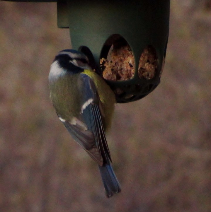 Viime viikolla huomasimme kuitenkin, että yksi talipalloista oli naposteltu liki kokonaan. Nyt viikonloppuna tekijätkin paljastuivat, kun bongasimme käpytikan ja sinitiaisen einehtimässä. Myös talitiainen kuuluu joukkueeseen.