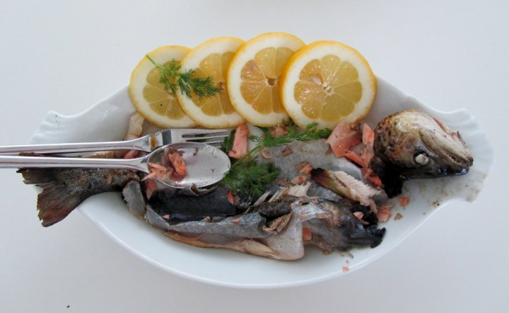 Onneksi eilinen pääruoka oli sangen kevyt, sillä se koostui vain grillatusta taimenesta ja perunasalaatista. Lähikaupasta löytyi tällä kerralla noin 700 grammainen meritaimen, jonka suolasin pari tuntia ennen grillaamista.
