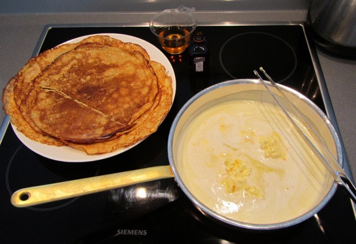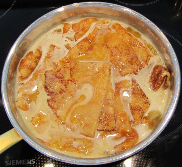 Kaivoin ”Ranskalaisen keittiön salaisuudet” esiin ja tempaisin Julia Childin ohjeen mukaan ruoan. Child mainitsee niin huvittavasti: ”Jokaisella keittiömestarilla on oma Crêpes Suzette-ohjeensa. Monista kokeilemistamme tämä tuntui erityisen hyvältä”. Kuinkahan monta ohjetta on tuntunut vähemmän hyvältä – ja kuka nyt ylipäänsä viitsii näitä valmistaa testatakseen ohjetta?