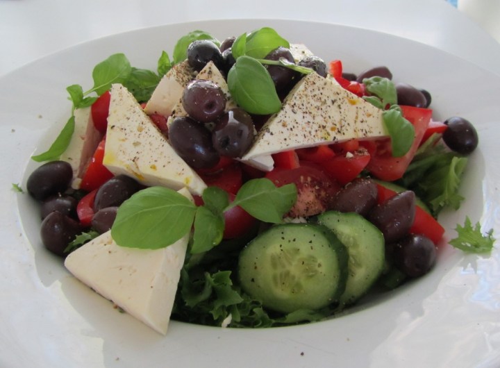 Aterian toinen keskeinen komponentti oli salaatti kreikkalaiseen tapaan. Tässäkään ei ole mitään tajuntaa räjäyttävää, vaan rapeaa lehtisalaattia, kevätsipulia, basilikan lehtiä, kurkkua, paprikaa, tomaatteja, Kalamata-oliiveja ja feta-juustoa. Kastiketta ei varsinaisesti ole, vaan ruiskauttelin salaatille oliiviöljyä, viinietikkaa ja mausteita (suolaa, mustapippurirouhetta ja kuivattua oreganoa).