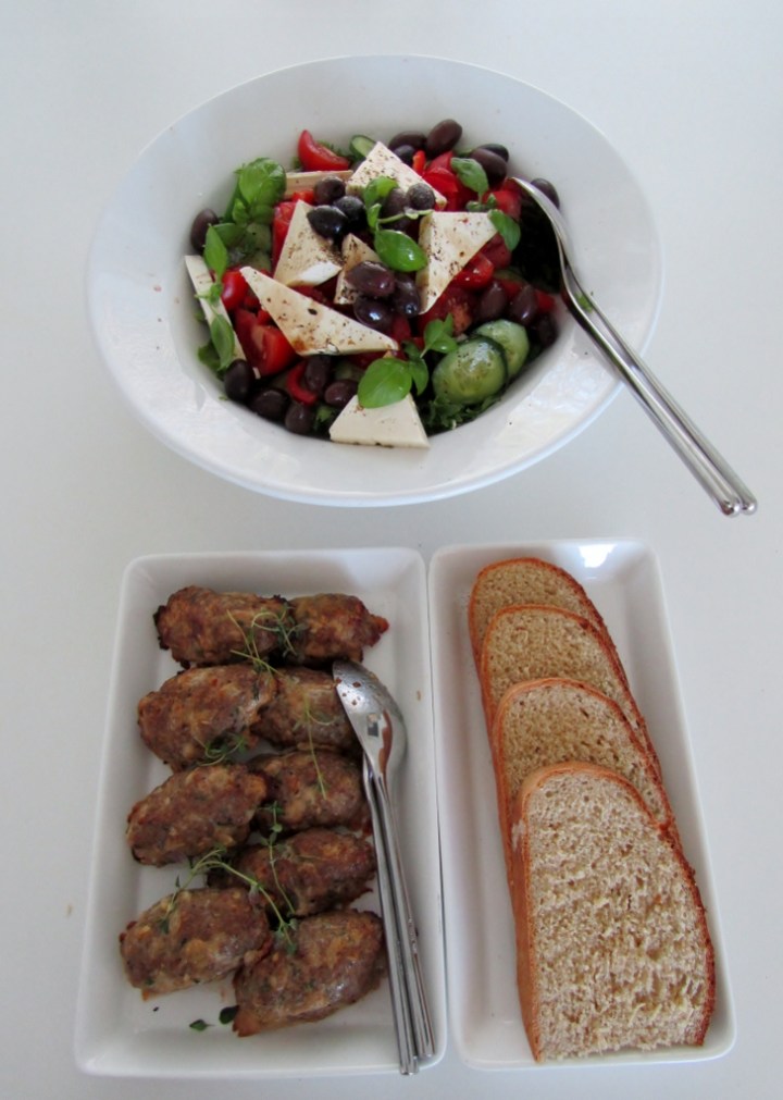 Ja tässä sitten kokonaisuus: kebakoita, kreikkalaista salaattia ja leipää. Kebakot ovat melko tavanomaista kotiruokaa meillä ja etenkin kesäaikaan. Tapaan ostaa lampaan jauhelihaa valmiiksi pakastettuna Mestaripalvista aina, kun käymme siellä. Pakasteesta löytyy näin aina vähän ”pahanpäivänvaraa”!