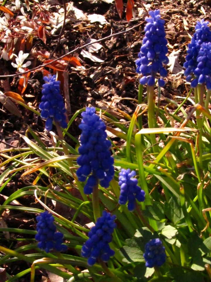 Ja suureksi yllätyksekseni myös pihanpuolen helmihyasintit innostuivat kukkimaan, vaikka ne ehtivät alkutalven lämpimillä säillä kasvattaa runsaan lehvistön.