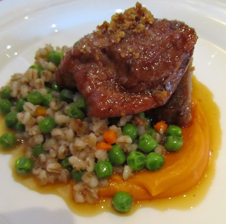 Makeudesta vastasi karamellinmakuinen bataattipyre. Jännittävin makuaines oli kuitenkin kastike tai liemi, jossa savunmakua toi Lapsang souchong-tee. Lisäkeosasto rakentui ohrasta, herneistä ja porkkanakuutioista.