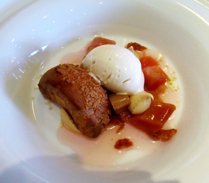 Vielä oli jäljellä tämä yhdistelmä: valkosuklaa, raparperi ja voi. Annoksessa oli tuulihattua, marinoitua raparperia ja valkosuklaata kolmella tavalla, joita en nyt pysty palauttamaan mieleeni (olin jo niin liikuttuneessa mielentilassa).
