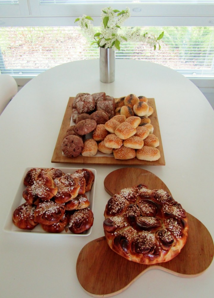 Jos pitäisi nimetä jokin ylivoimaisesti myönteisin web design-työstä aiheutuva juttu, niin se olisi pakottava tarve saada tehdä vastakohdaksi nettityölle jotakin konkreettista, ei-binääristä ja kerralla onnistuvaa. Viimeksi, kun palasin bittimaailmasta, leivoin Prinsessatortun, ja nyt päätin räjäyttää pajazzon ja leipoa pakastimen täyteen leipää, sämpylää ja pullaa. Kuvassa todisteet puolen päivän puuhailuista.