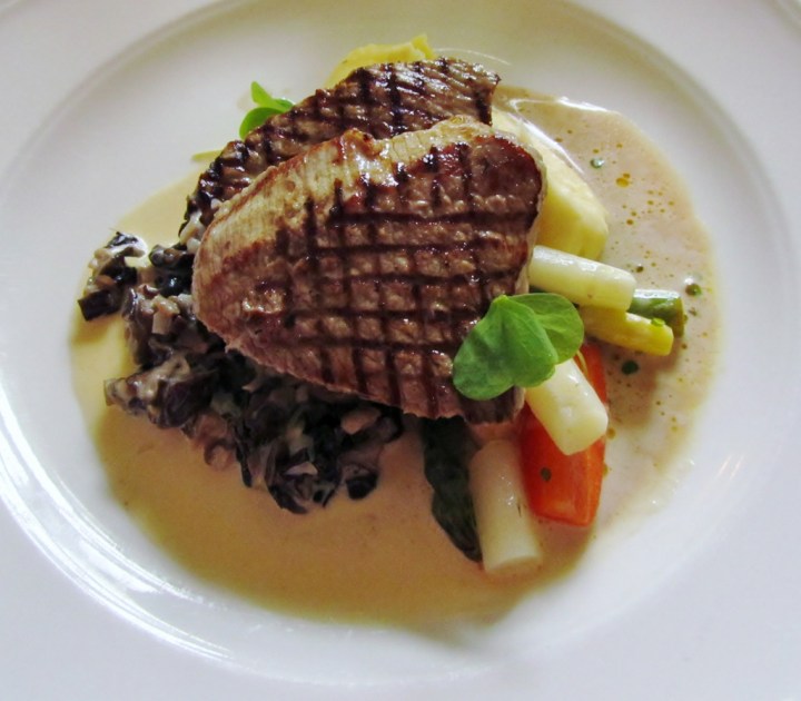 Me Rouvat (ja yksi Herrakin) valitsimme pääruoaksi vasikanpaistikkeet korvasienien kera. Kaunis keväinen kokonaisuus, jonka makumaailma oli puhdas ja raikas. Parsat ja mitä herkullisin perunapyre täydensivät annosta.
