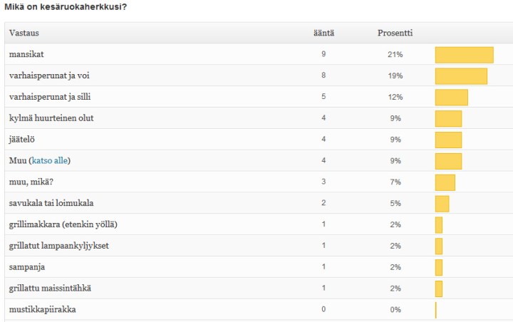 Kun nyt tilastohommiin ryhdyttiin, niin tässäpä vielä tuloksia alkuviikon kesän maku -kyselystä. Mansikathan sitten vetivät voiton! Listalta puuttuivat herneet, GT, mustikkakukko ja vesimeloni. Vaille ääniä jäivät mustikkapiirakka, Pömi (!), tilliliha, kaalikääryleet (!!) ja grillatut katkaravut – joita edes ehdottaja (Herra R.) ei vaivautunut äänestämään!