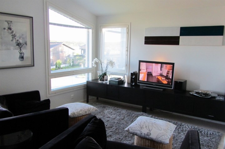 Samoin kuin musta, aiemmin television edustalla ollut matto sohvapuolelle. Koti sai muutamalla kädenliikkeellä aivan uuden ilmeen. Ja tulipa siinä sivussa imuroituakin ja pyyhittyä pölyt senkeistä.