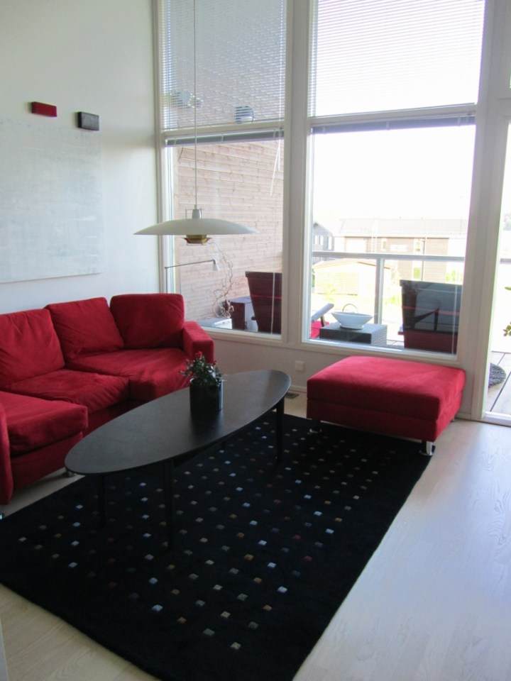 Rouva Pirkanmaalta katseli sunnuntaina olohuonettamme ja sanoi, että sohvan edustalla oleva mattomme sopisi paremmin nyt uuden taulun edustalle. Ajatus jäi kaihertamaan, vaikka sen silloin torppasinkin. Illansuussa juttelimme Herran kanssa, että pitäisi oikeastaan kokeilla kahden mustan senkin sijoittamista samalle seinustalle. Puimme hetken myös Rva P:n ehdotusta ja päätimme kokeilla mattojen vaihtoa. No johan natsasi!