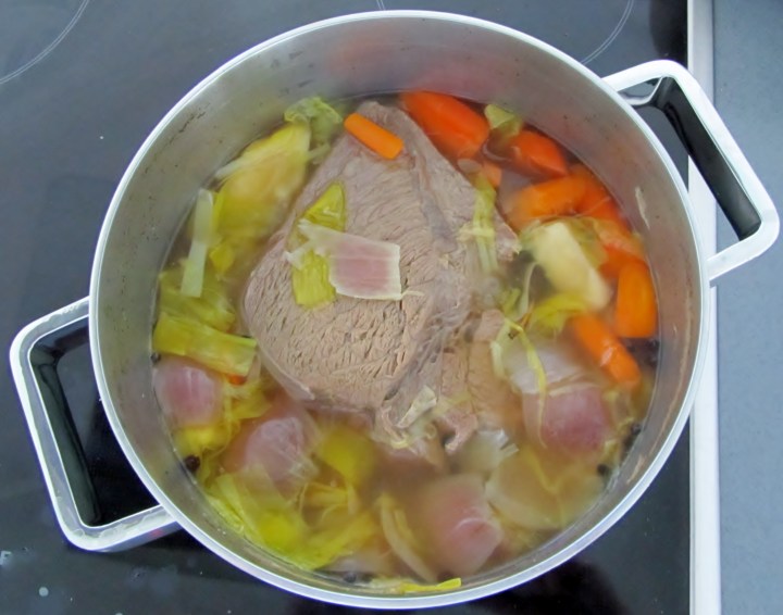Keitä lihaa miedolla lämmöllä noin 1,5 tuntia. Kokeile kypsyyttä tikulla: jos se uppoaa pehmeästi lihaan, on liha kypsää. Luisesta lihasta voi kokeilla luun irrottamista: jos se lähtee, niin liha on kypsää. Nosta liha kattilasta ja siivilöi liemi, jätä odottamaan. Liemijuureksista ei yleensä ole enää mihinkään, joten ne voi heittää menemään.