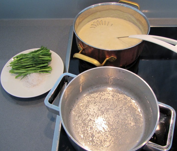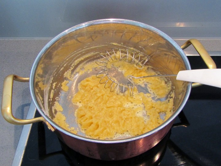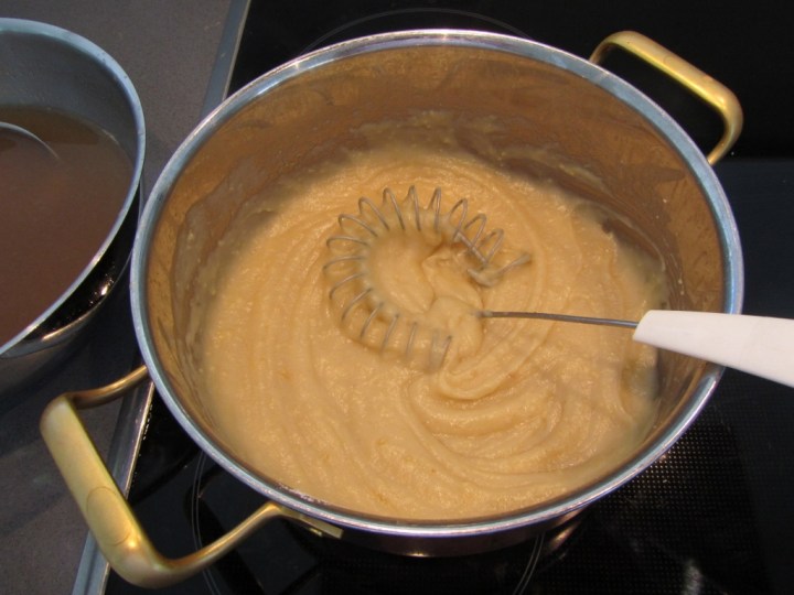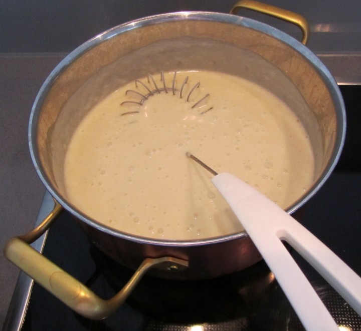 Veikkaisin, että tässä vaiheessa piilee vaalean kastikkeen eli velouté-kastikkeen valmistamisessa suurin mahdollisuus virheeseen: vehnäjauhosuuruisteisia kastikkeita pitää kypsentää pidempään kuin suositellut noin 10 minuuttia. Toki vehnä ehtii tuossa ajassa kypsyä, mutta sen maku ja rakenne paranevat pidemmällä keittoajalla. Kastikepohjaan mahdollisesti muodostunut sitko (voimakkaan vatkaamisen aikana) ikäänkuin raukeaa pidemmällä keittoajalla. Kokeilkaapa! Etenkin vanhan ajan läskisoosissa eron huomaa.