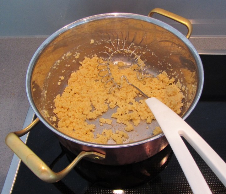 Paahda jauhoja hetki. Ne eivät kuitenkaan saa ruskistua – paitsi, jos haluat valmistaa ruskeakastikkeen. Lisää tässä vaiheessa puolet lihaliemestä ja sekoita voimakkaasti.