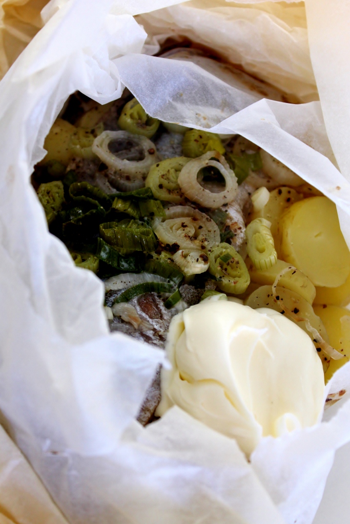 Kuva-arvoitus: mitähän lienee paketeissa? Otsikkohan sen jo paljasti: runsaasti kypsennettyjä Siikli-viipaleita, kevytsuolattu sillifile, hienonnettu kesäsipuli, ripaus mustapippuria ja nokare voita. Paketit uuniin, joka on kuumennettu noin 225 C. Kymmenisen minuuttia…