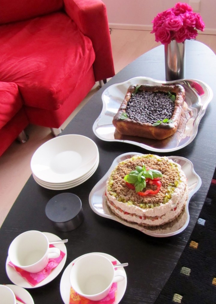 Keskiviikkona saimme kahvivieraita, ja valmistin jo tutun ”Erilaisen voileipäkakun” suolaiseksi palaksi. Takana häämöttää mustikkapiirakka, joka oli makea pala. Erilaisen voileipäkakun olen esitellyt täällä blogissa jo aiemminkin, mutta kuva oli siinä jutussa aika surkea. Ohjettakin olen vähän parannellut. Tässä siis uusintalähetys!