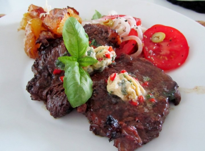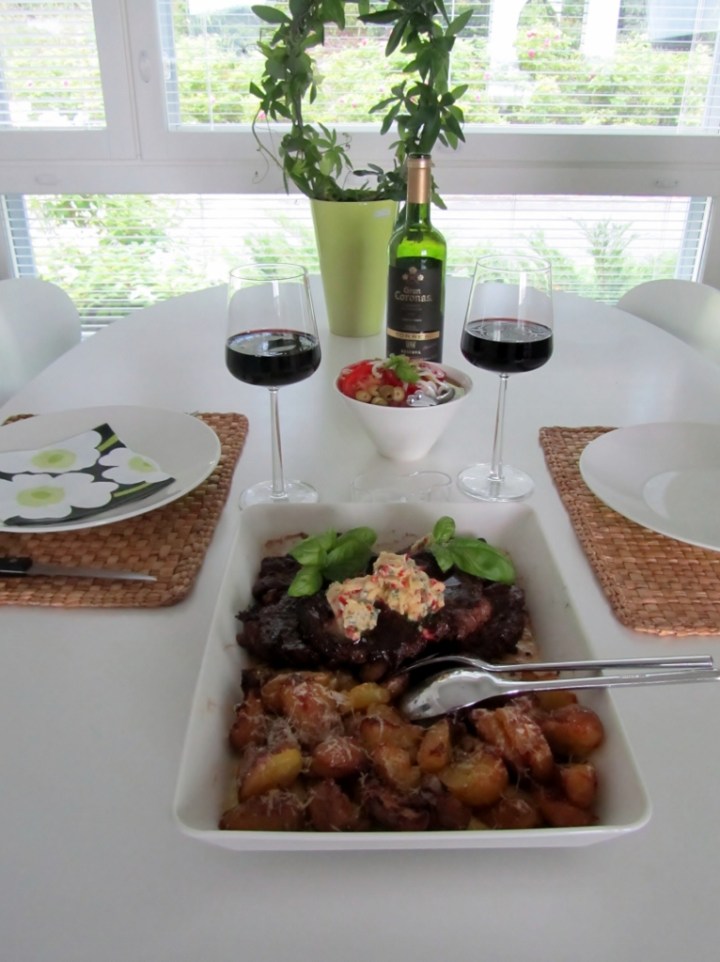 Valuta ja kuivaa entrecote-pihvit. Grillaa ne medium-kypsiksi. Nosta kuuma perunavuoka uunista, lado sille pihvit ja jaa maustevoi pihveille. Näin säilyvät pihvit kuumina! Tarjoa hyvän viinin ja mainion seuran kera.