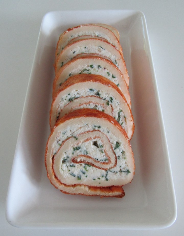 Levitä täyte jäähtyneelle munakasrullalevylle ja rullaa levy napakasti. Kääri rulla leivinpaperiin ja siirrä jääkaappiin vetäytymään. Leikkaa tarjolletuotaessa noin senttimerin paksuiksi viipaleiksi. Salaatti ja valkoviini sopivat kumppaneiksi.