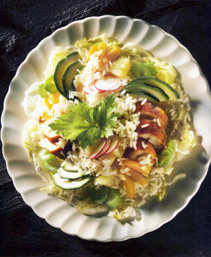 Ylimmässä kuvassa on kasvistagliatellea, sitten kalaa valkoviinikastikkeessa riisin kera ja tässä kanasalaattia.