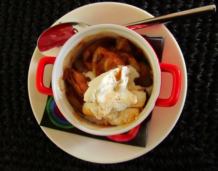 Tässä sitten rommiomenat, joita valmistin meille lauantaina. Meillä ei ole omenapuita eikä tuttaviakaan, joilta kotimaisia omenoita voisi ruinata, joten tein ruoan lähikaupan ompuista. Nokare vaniljajäätelö kruunasi herkun.