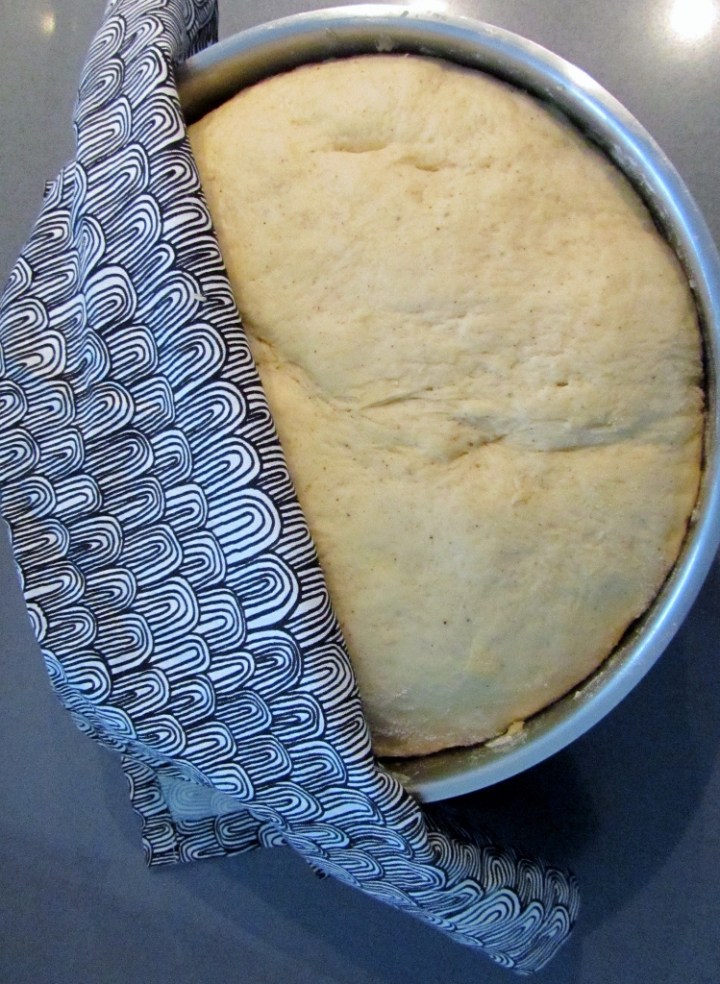 Kun taikina on kohonnut tilavuudeltaan kaksinkertaiseksi eli tuon näköiseksi kuin ylläolevassa kuvassa, kumoa se kevyesti jauhotetulle leivinpöydälle. Kanelipullia varten kauli taikinasta noin senttimetrin paksuinen levy.
