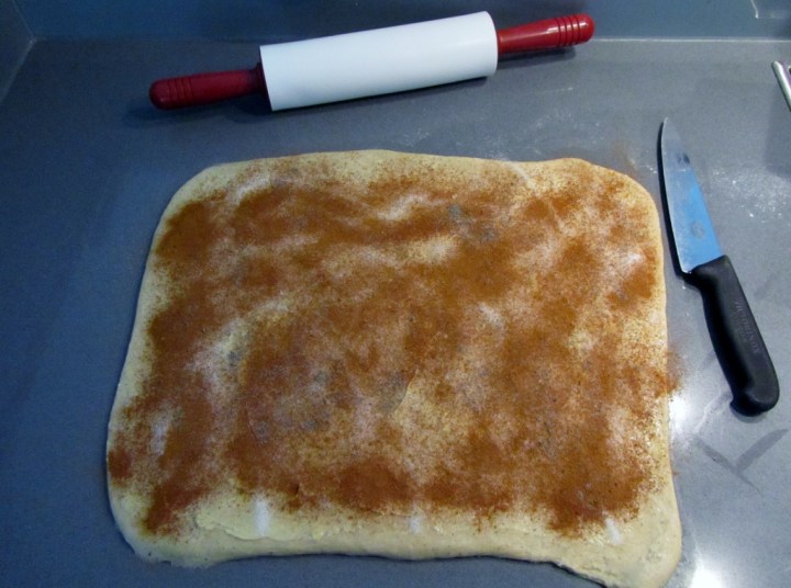 Voitele taikinalevy kevyesti voilla ja ripota sille sokeria, kanelia ja ripaus kardemummaa. Jos haluat leipoa ruusupullia, taita taikinalevy kaksinkerroin ylhäältä alaspäin.